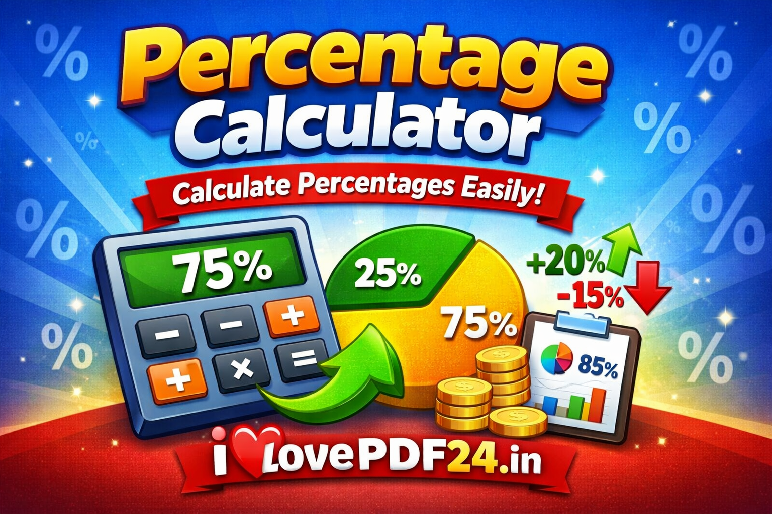 Percentage Calculator ek free online tool hai jo aapko percentage calculate karne me madad karta hai. Is tool se aap exam marks ka percentage, discount, profit-loss ya percentage increase/decrease easily nikal sakte ho. Bas values enter karein aur instant, accurate result paayein – bina signup, bina kisi tension ke, sirf iLovePDF24.in par.